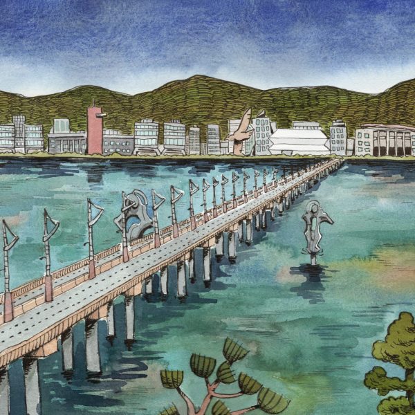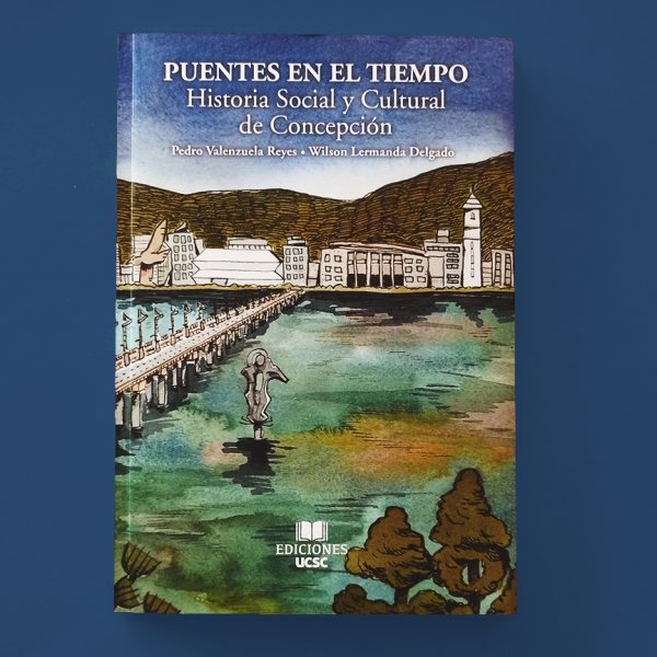 Ilustración de la portada para el libro “Puentes en el tiempo. Historia Social y Cultural de Concepción” de Pedro Valenzuela y Wilson Lermanda de ediciones UCSC.