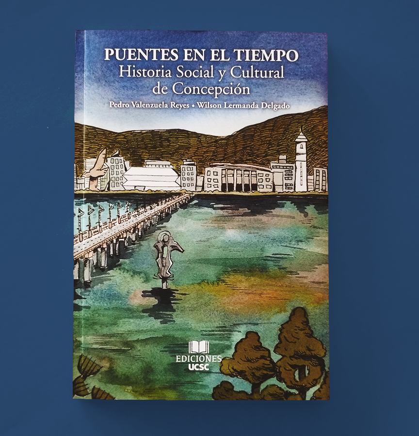 Ilustración de la portada para el libro “Puentes en el tiempo. Historia Social y Cultural de Concepción” de Pedro Valenzuela y Wilson Lermanda de ediciones UCSC.